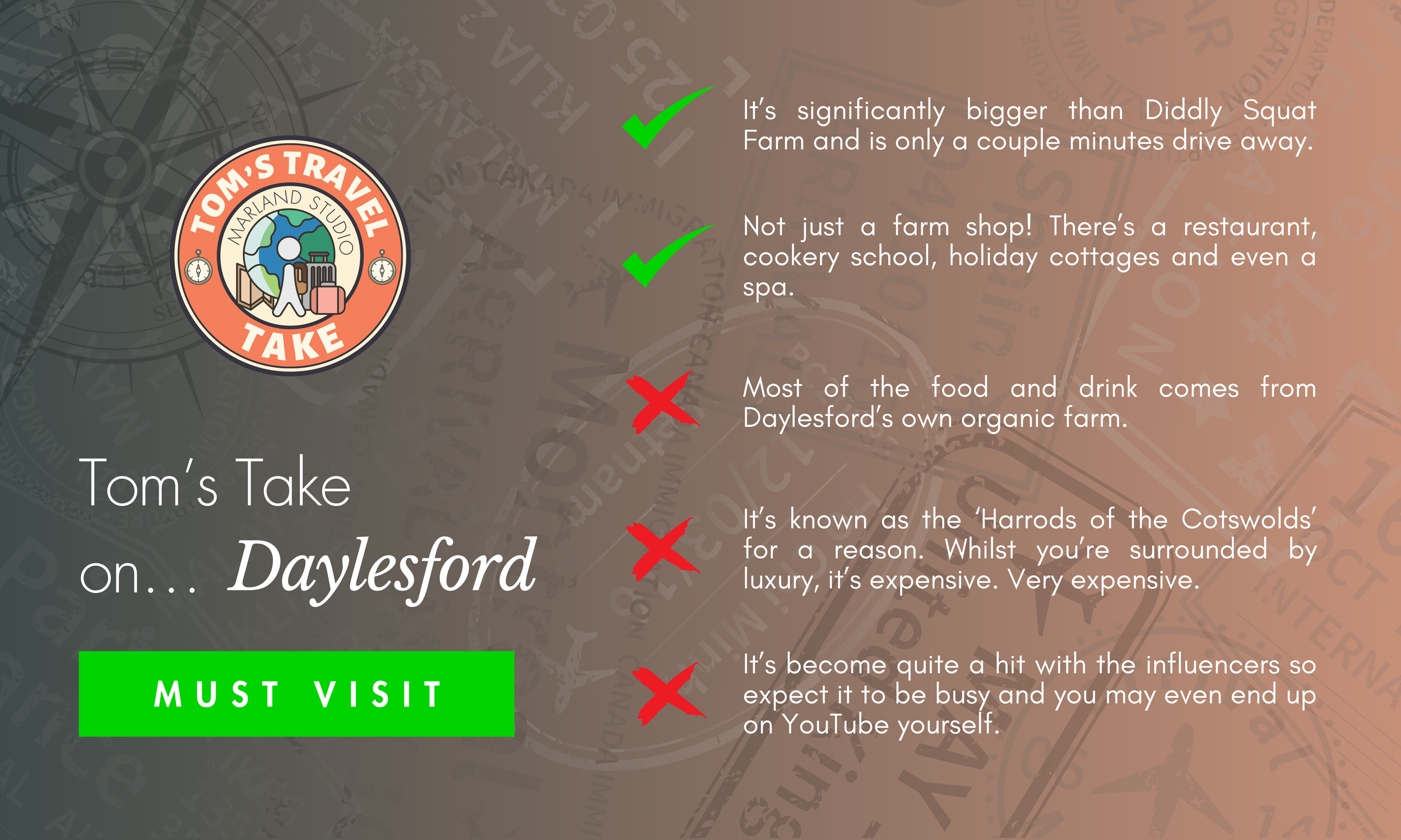So, similarly to Diddly Squat Farm Shop, I will urge you to visit this place and wander around and dream of what you’re next Tesco shop will look like when that Euromillions ticket wins you a fortune. It’s the perfect place to gander when the weather is bad and there’s a coffee shop. But, when you visit, just remember to smile. It’s become enormously popular with influencers so and you may see the odd person appearing to talk to themselves all in the name of social media and you may even appear on YouTube yourself. Just don’t forget to take that all important Instagram photograph at the from because we’ll all then know that you’ve made it.